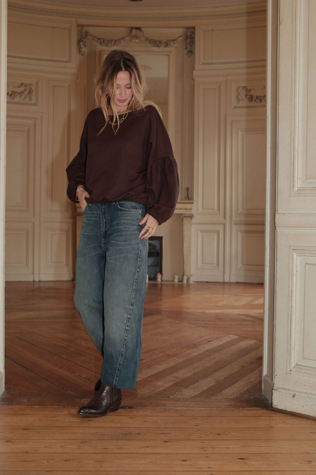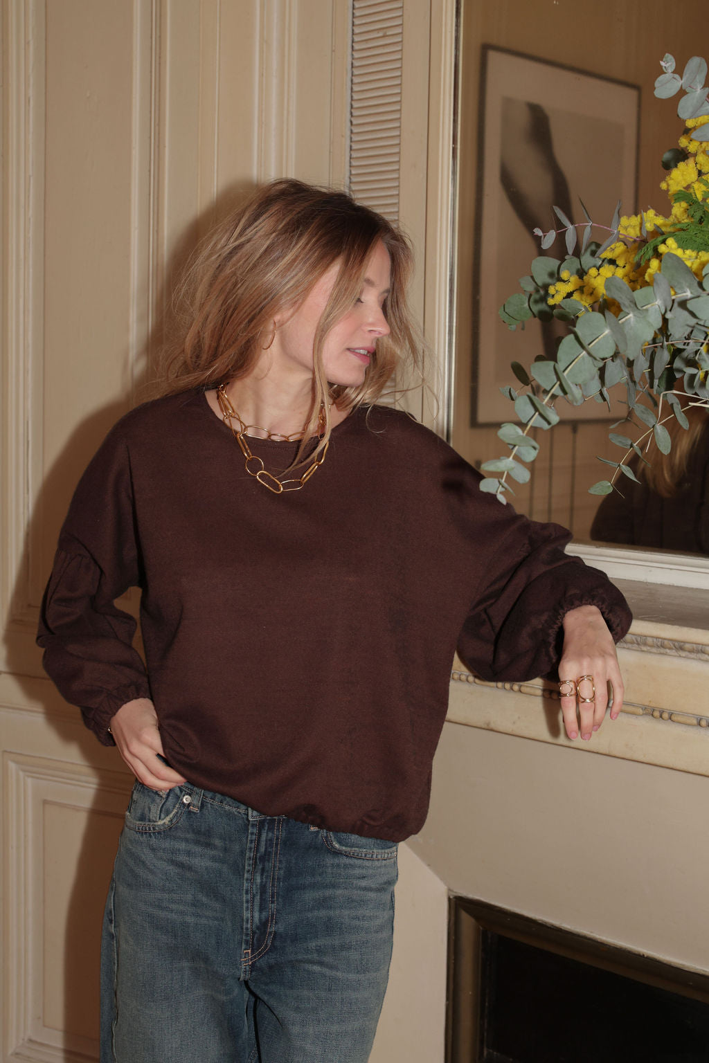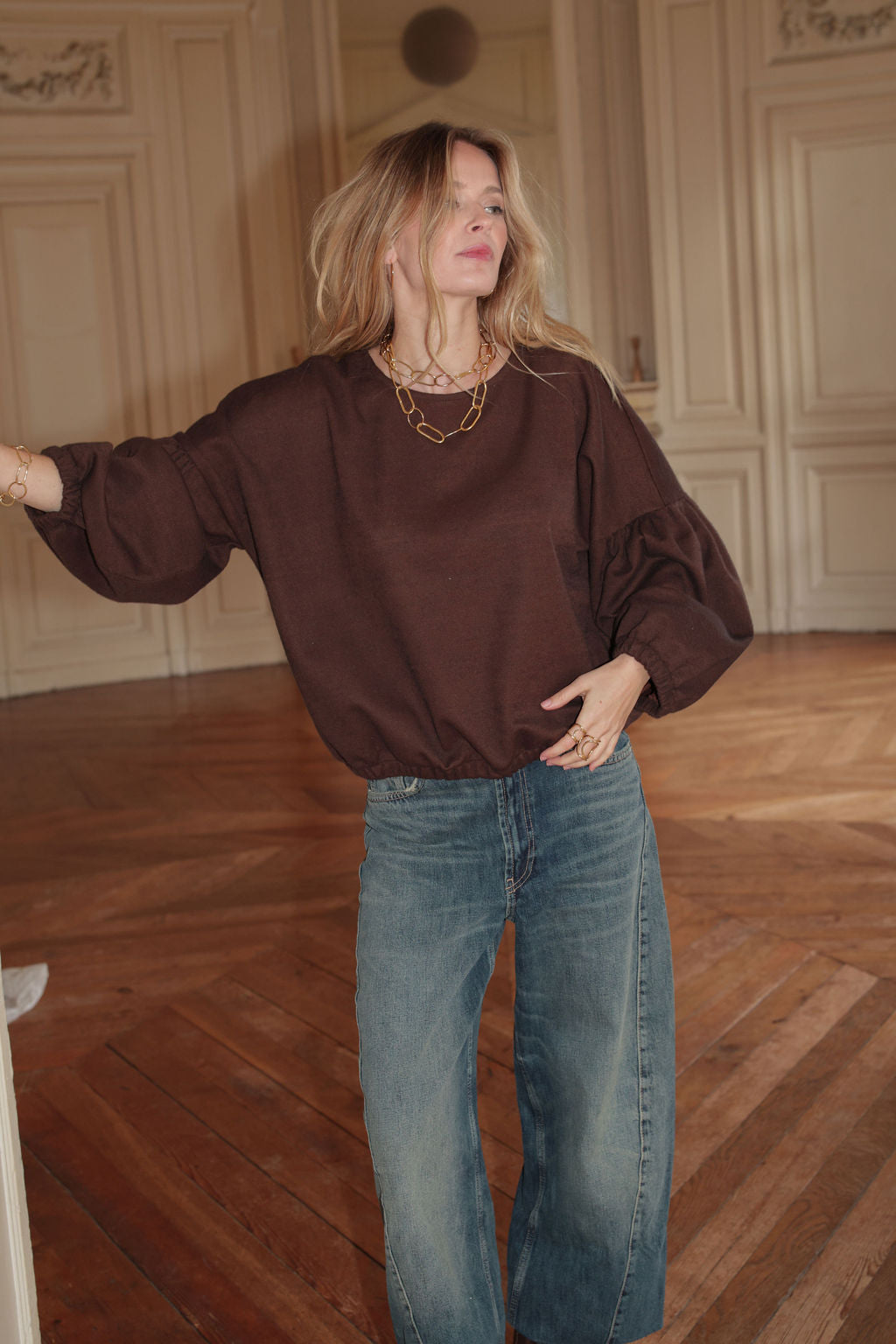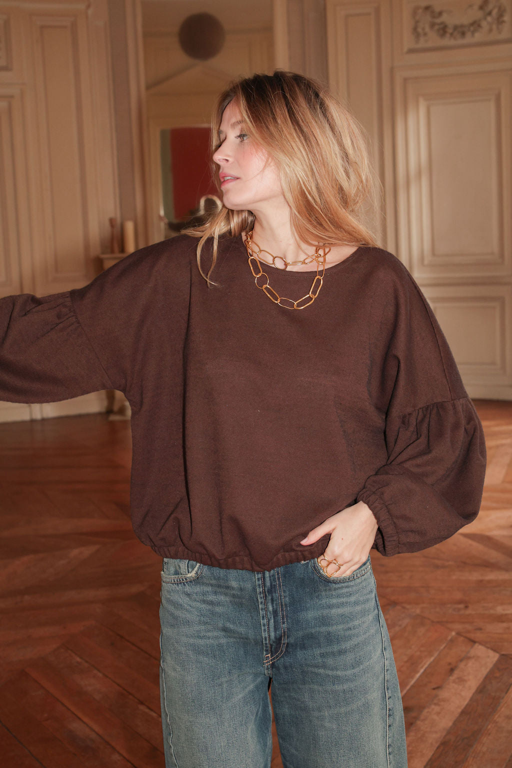 "J'aime cette version adorable et cosy, confectionnée dans un magnifique tissu cacao. PLUME se glisse dans notre vestiaire pour nous tenir bien chaud avec une touche de fantaisie et un style résolument charmant !"