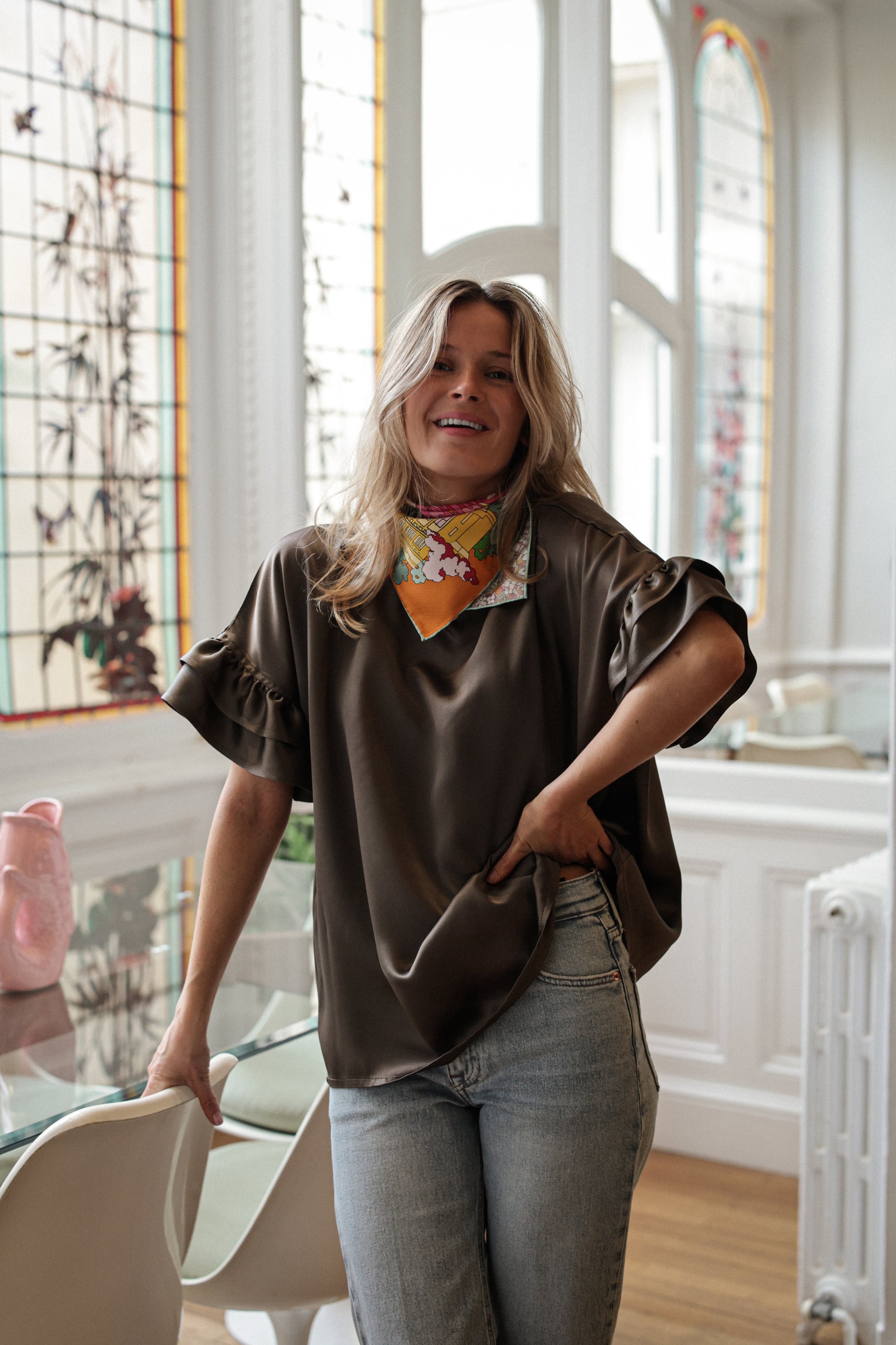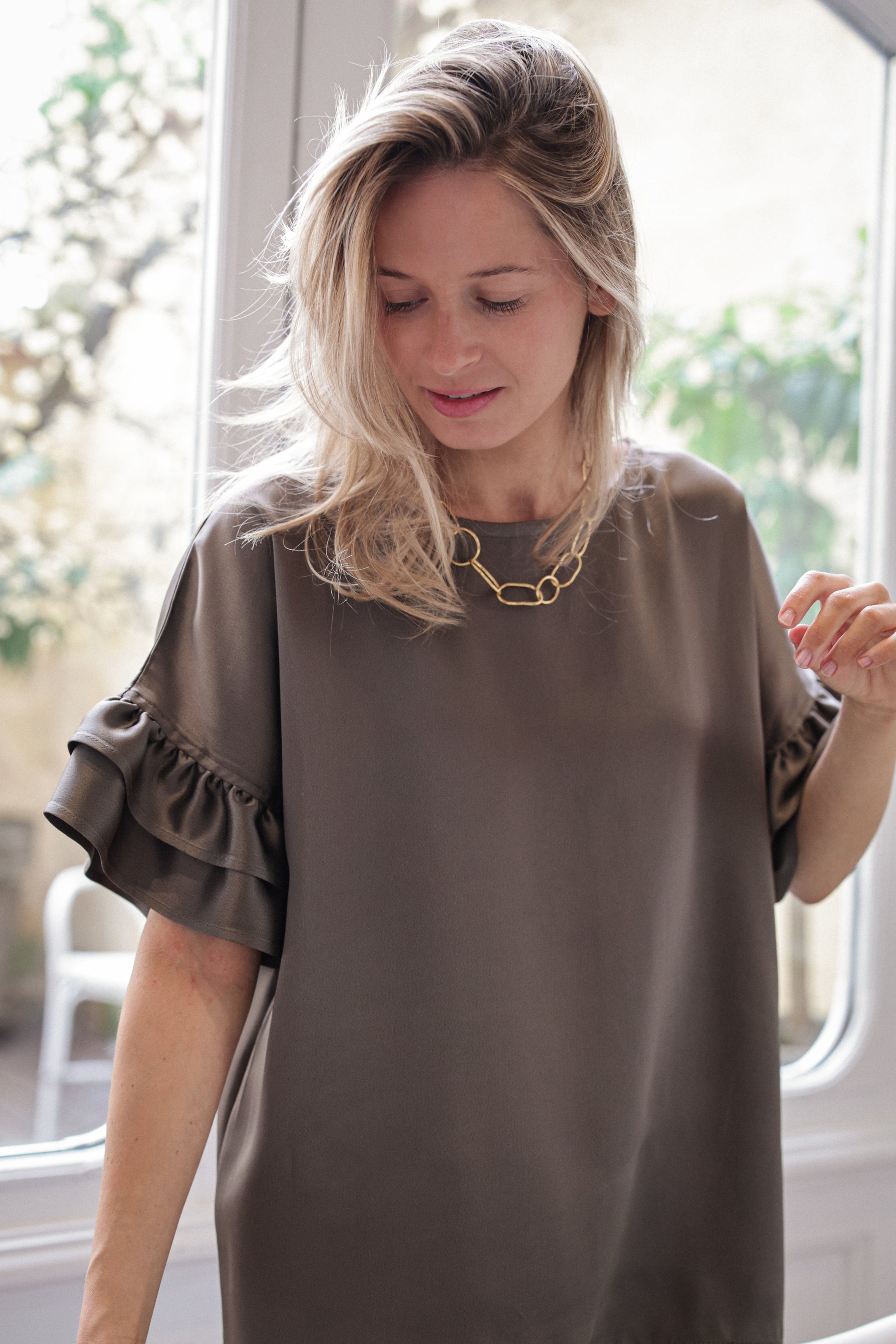 Le top GUSTAVE revient dans une version plus estivale et habillée, confectionné dans un magnifique satin double face haute couture, un coloris kaki qui tire vers le gris juste sublime ! GUSTAVE a une coupe loose, une encolure dégagée et un double volant sur les manches.